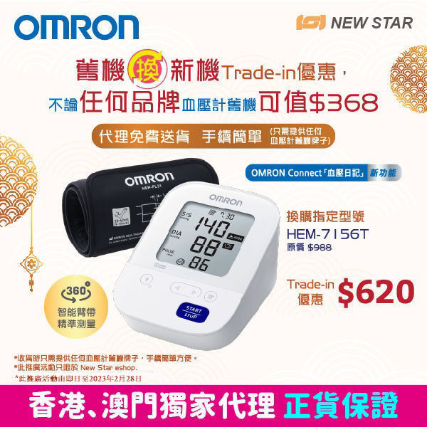 [舊機換新機 Trade-in 優惠]HEM-7156T 藍牙手臂式血壓計智能臂帶具有 360° 精準測量 智能手機血壓日記管理血壓偏高提示心律不齊檢測臂帶佩戴自檢誤動作提示60次記憶10分鐘內3次平均值高智能加壓技術五年保用香港、澳門獨家代理,正貨保證*收貨時只需提供舊機牌子,手續簡單方便。*此推廣活動只限於 New Star eshop.*此推廣活動由即日起至2023年2月28日。