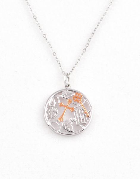 每一个生命都有自己的旋律,这款925纯银颈链以其独特的设计,象征着生命中的多样性与选择。圆形吊咀融合了树叶、鸟笼、十字架、雪花和锁匙五大元素,寓意着: