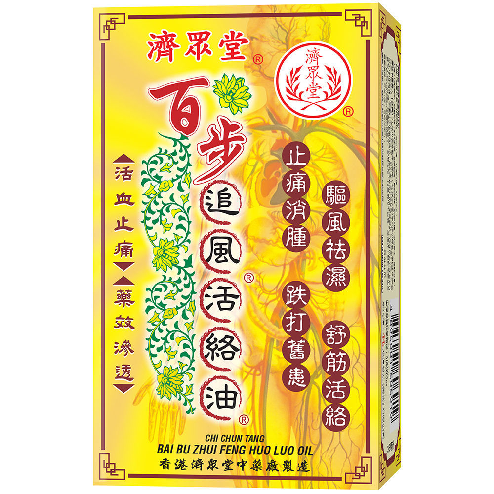 濟眾堂百步追風活絡油乃源自本堂經驗良方製造而成,能舒緩跌打舊患,運動扭傷,關節疼痛,四肢麻痺,頸肩酸痛。搽用本藥油後,藥效滲透,舒筋活絡,止痛消腫。