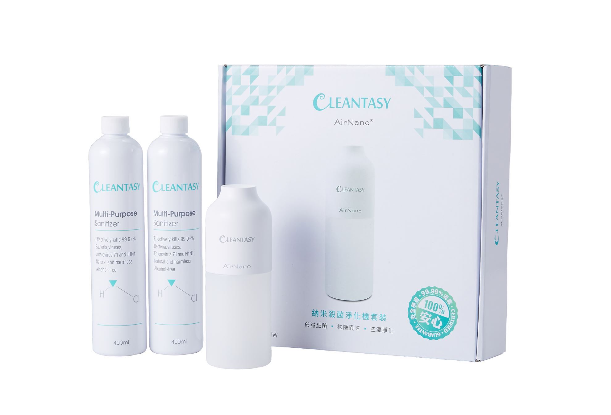 套裝包括:AirNano® 納米殺菌淨化機 X1+德潔施®多功能除菌液 400ml X2