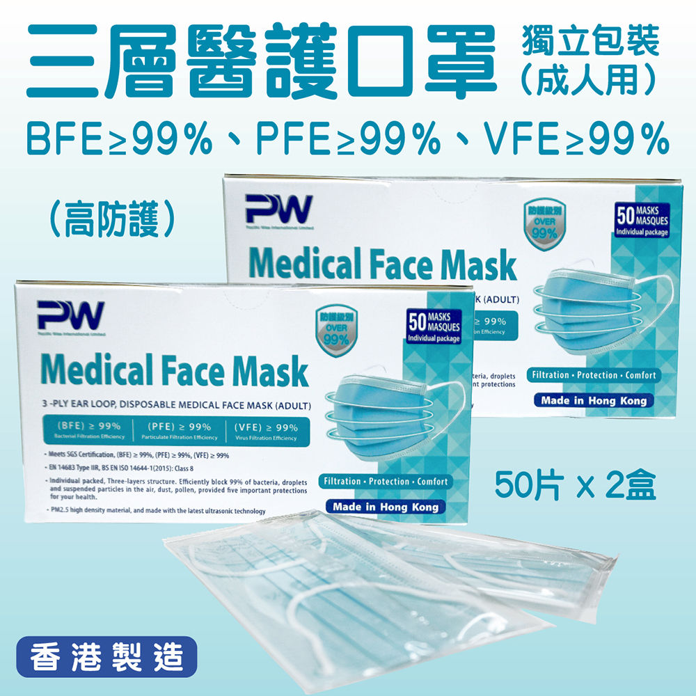 PW - 口罩 成人用 BFE + PFE + VFE≥99% 三層醫護口罩 獨立包裝 高防護 (香港製造)(2盒) (50個/盒)